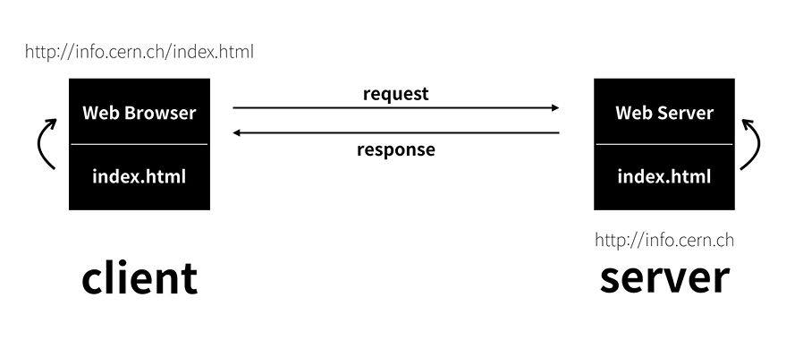 - info.cern.ch 주소를 가진 컴퓨터는 하드디스크에서 index.html 파일을 찾고, 해당 파일의 정보를 전기적 신호로 변환하여 웹브라우저가 설치되어있는 컴퓨터에 전송해준다. (전기적 신호에는 index.html 파일 안에 있던 코드가 담겨있다)