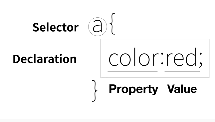 Declaration( 'color:red;' ) : 선택자가 지정하는 태그들에 대해서 '어떤효과' 를 줄 것인지에 해당되는 부분이다.