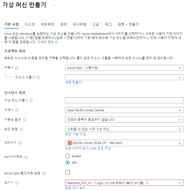 다음으로는 가상머신 만들기에서 필요한 가상머신의 크기에 따라 옵션을 선택해준다.