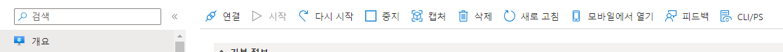 가상머신을 제대로 만들었다면 가상머신-개요 페이지의 상단에 다음과 같이 뜰 것이다. (가상머신이 기동중이므로 시작버튼이 비활성화 된 상태) 혹시 시작버튼이 활성화되어있다면 아직 가상머신이 기동하지 않는 상태이므로 "시작"을 눌러 시작하면 된다!
