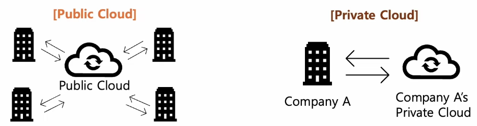 - Private Cloud : 한 기관에 전용으로 제공되는 클라우드 환경, 내부적으로 또는 제3자에 의해 관리되며 높은 통제력, 보안 및 규정 준수