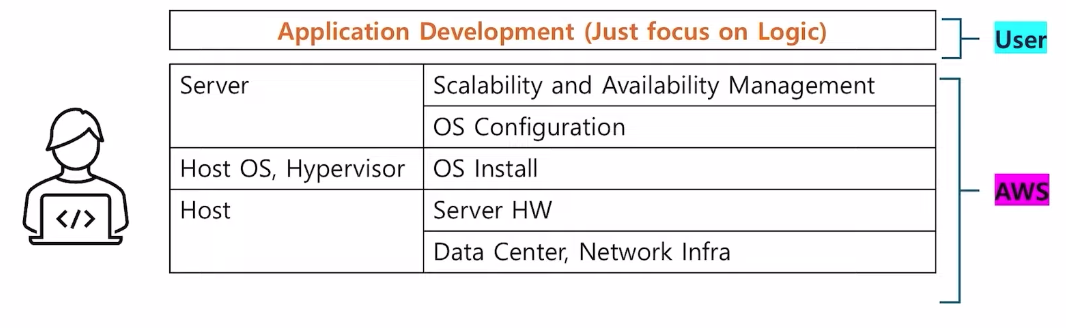 - 서버리스란, 서버가 없다는 뜻이 아니라 AWS가 논리 서버와 서버 관련 인프라를 관리하므로 사용자가 서버를 관리할 필요가 없다는 뜻
