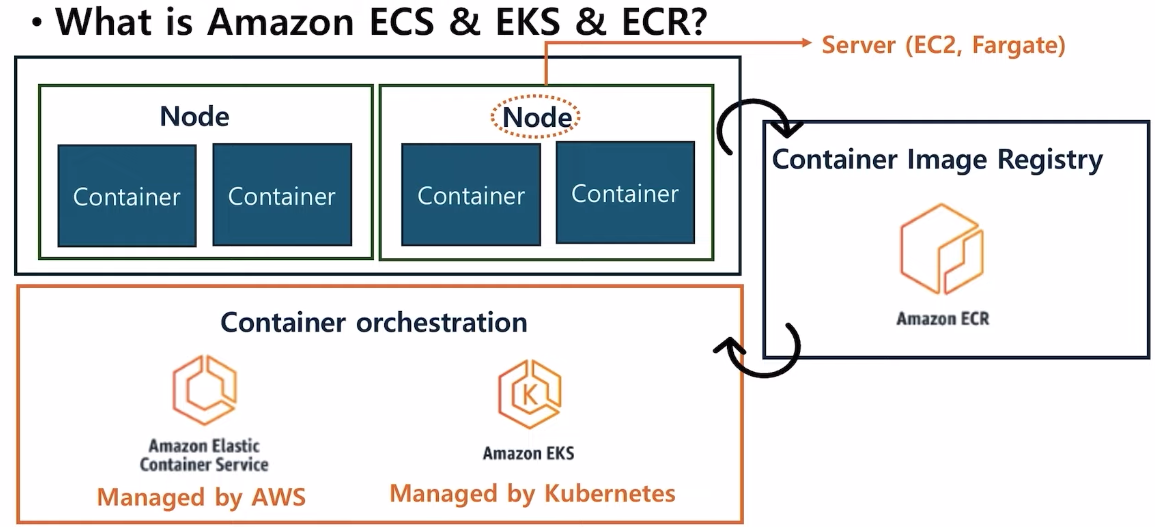 - ECS, EKS의 가장 큰 차이점 → 컨테이너 오케스트레이션 기능을 AWS가 담당하는지, 쿠버네티스가 담당하느냐의 차이