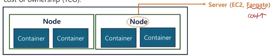- 각 컨테이너는 노드에 포함되며, 노드는 컨테이너를 실행하는 서버라고 보면 된다. 이 서버는 EC2, Fargate를 활용할 수 있다.