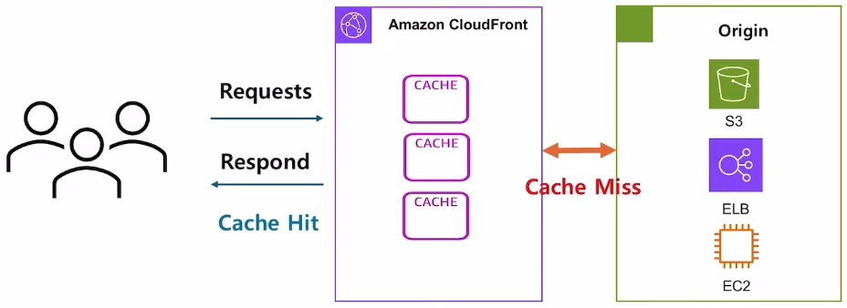 - 사용자가 요청을하면→ 엣지 로케이션에서 요청된 컨텐츠가 이미 캐시되어있는지 확인2) → 캐시안되어있다면 cache miss → 오리진 서버에 요청하여 데이터를 받아 다시 엣지 로케이션에 캐시