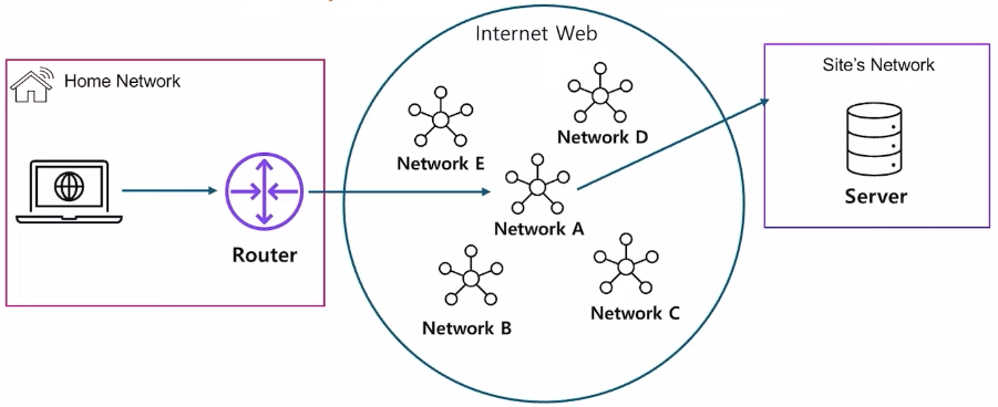 - 라우터는 이 정보를 바탕으로 라우팅 테이블을 조회, 라우팅테이블을 통해 최적의 경로를 설정 → 패킷을 다음 홉으로 전달한다. → 패킷이 최종 목적지에 도달할때까지 반복된다.