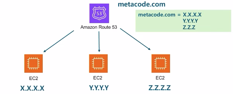 - e.g. metacode.com → 해당되는 IP주소를 매핑 → 해당 IP 주소가 연결되어 있는 ELB로 연결 → 들어온 트래픽을 EC2 인스턴스에 분배