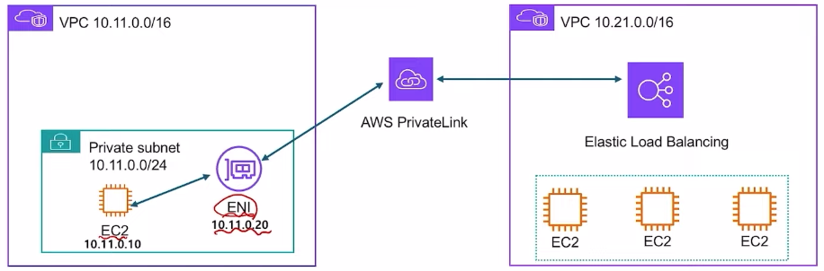 - 퍼블릭 인터넷에 트래픽을 노출하지 않고도 AWS 서비스간에 안전한 비공개 연결을 제공하는 서비스