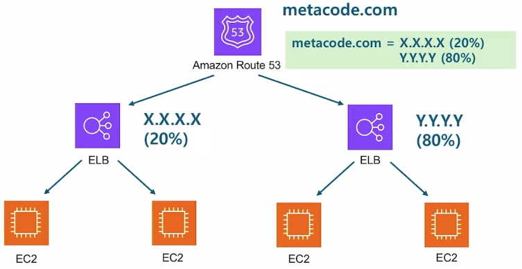 - e.g. metacode.com → X.X.X.X 로 라우팅할지, Y.Y.Y.Y로 라우팅할지 미리 선정해놓은 가중치에 따라 트래픽을 분배하는 라우팅 방법