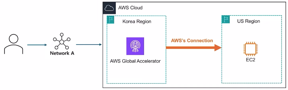 - AWS Global Accelator 엔드포인트 까지 온다면, 엔드포인트가 AWS 네트워크 통해 원본 서버까지 좀 더 빠르게 접근 가능