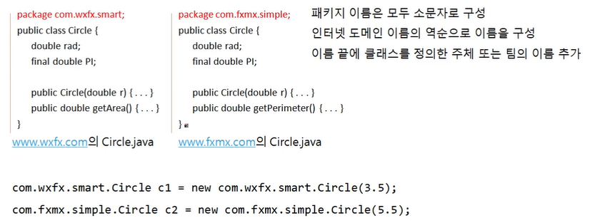- 서로 다른 패키지의 두 클래스는 인스턴스 생성 시 사용하는 이름이 다르다.