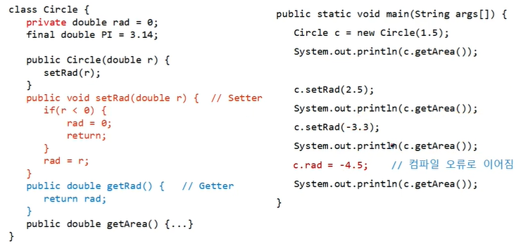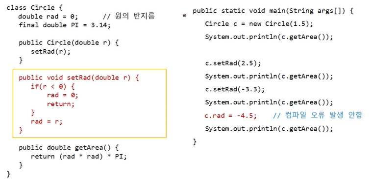 문제점 : c.rad = -4.5로 인스턴스변수에 직접 접근하여 값을 할당하였을 경우, 생성자를 호출하면서 초기화한 경우와 달리 컴파일 오류가 발생되지 않는다. (c.rad = 4.5로 초기화 된다)
