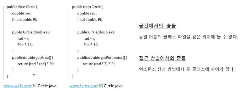 ( 동일한 이름의 두 클래스를 동시에 import하면 컴파일 오류가 발생한다.)