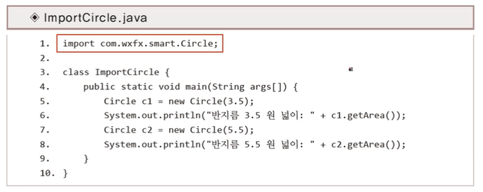 imort 명령어를 통해 명명을 해놓으면, Circle이라고 불러도 해당 패키지 위치에 있는 Circle 클래스를 불러다 쓸 수 있다.
