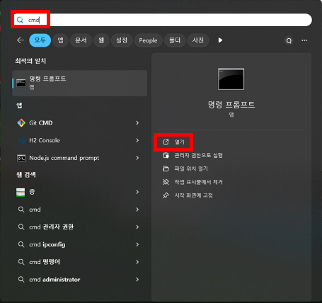 windows 시작 버튼 > "cmd" 검색 > "열기" 를 통해 명령 프롬프트를 실행한다.