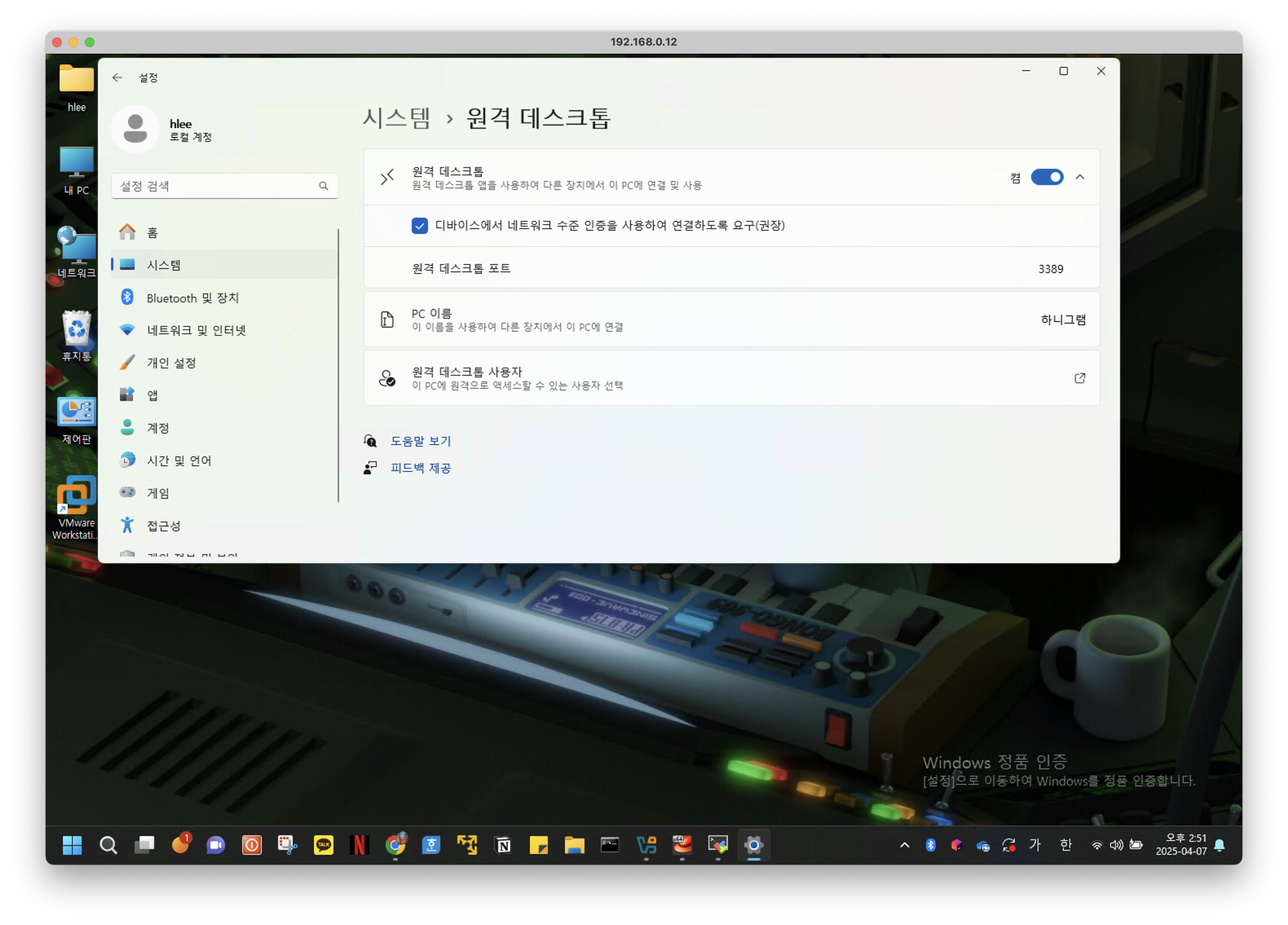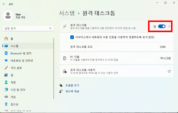 원격 데스크톱 설정을 "켬"으로 변경해준다.