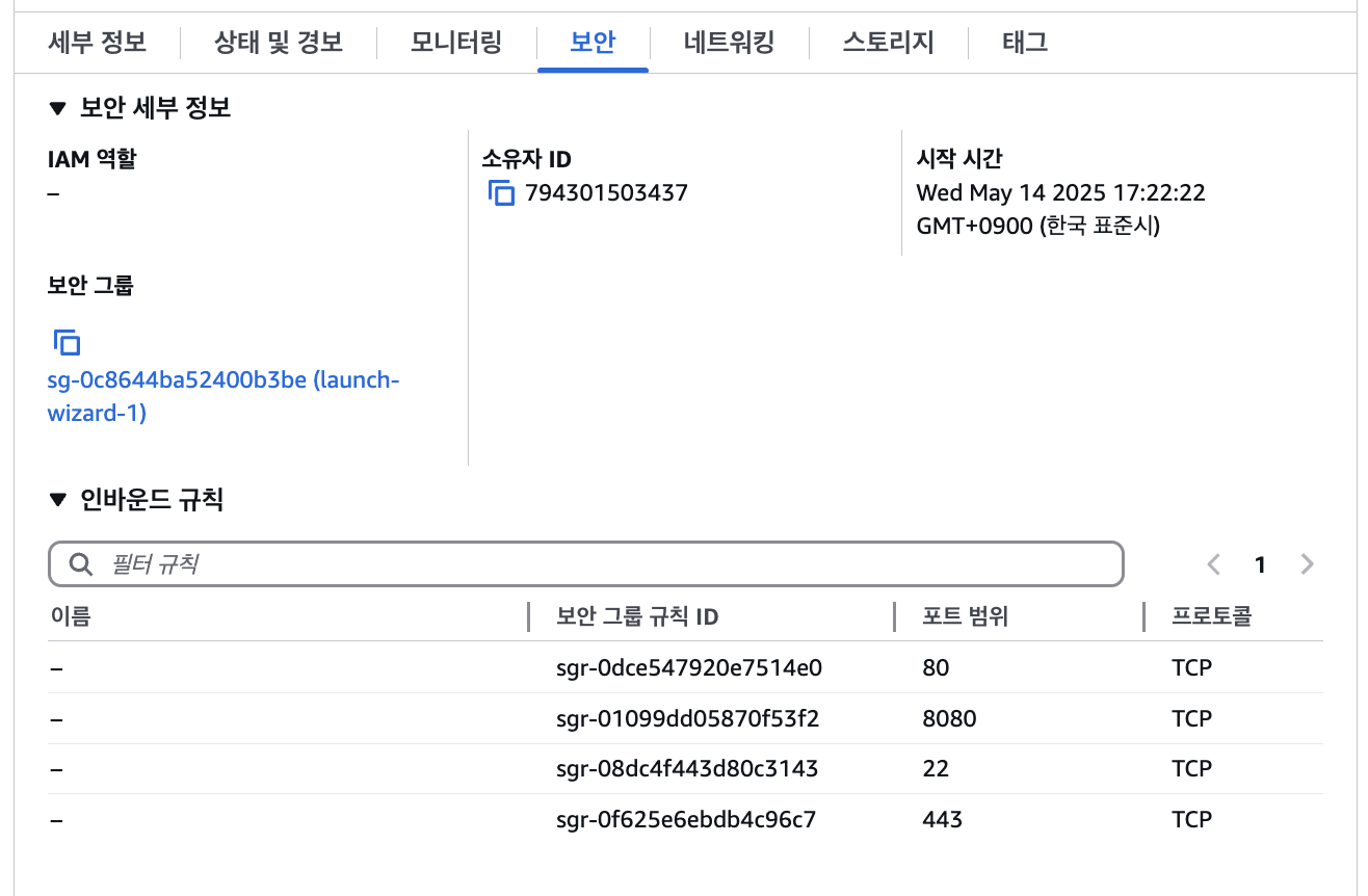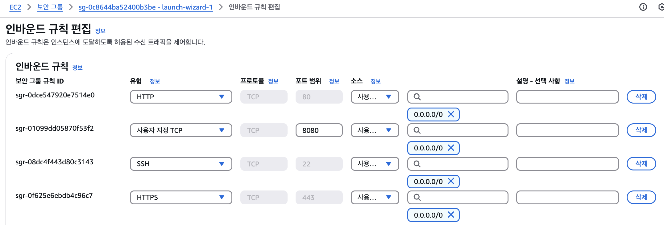 EC2 서버를 생성할 때, 보안그룹 새로 생성이 포함되었기 때문에 EC2탭 > 네트워크 및 보안 > 보안그룹을 확인해보면