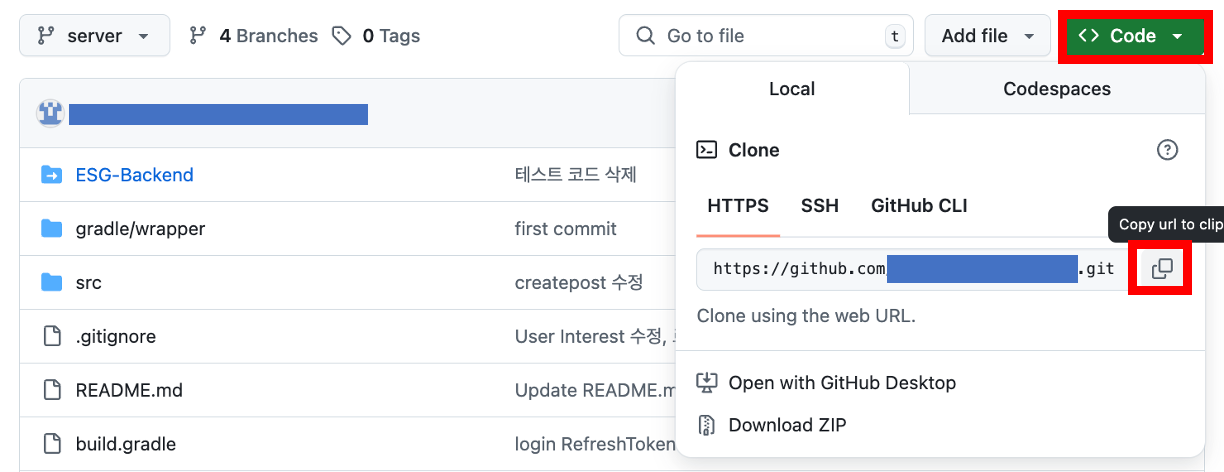 EC2 서버에 올리고자 하는 프로젝트의 Github Repository 주소를 복사한다.
