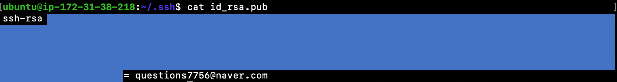 이때, id_rsa.pub (공개키) 내용을 cat 명령어로 출력하여 확인하고, 이를 github의 ssh에 저장해주어야한다.