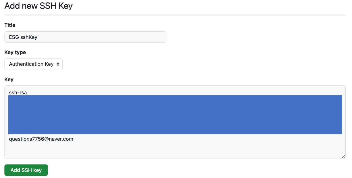 Github > Setting > SSH and GPG keys > New SSH Key 버튼을 클릭 후, Key 내용에 붙여넣기하여 SSH Key를 추가한다.