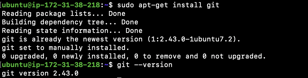 깃 클론을 사용할 것이기 때문에, 해당 우분투 서버에 git을 설치해준다.