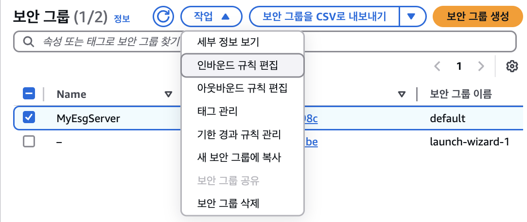 만약 보안그룹을 새로 생성했었다면, 연결을 원하는 EC2 인스턴스 > 작업 > 보안 > 보안그룹 변경을 통해