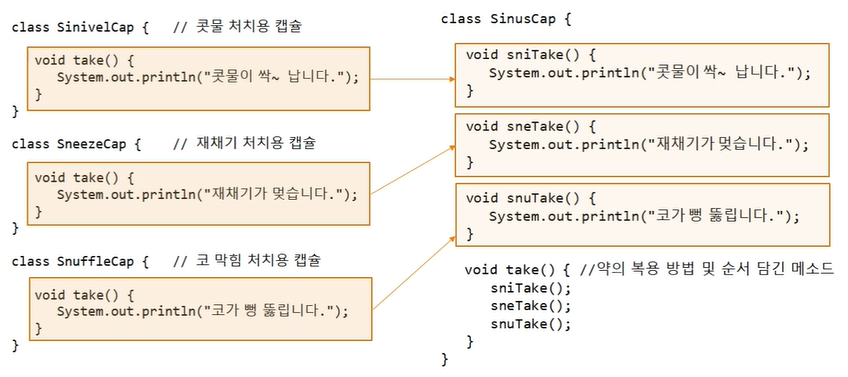 감기약에 관련된 캡슐로 캡슐화한다! >>> Take()를 부르기만 하면 순서에 맞게 사용할 수 있게 된다.