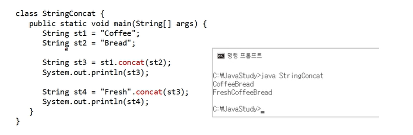 str3 = str1.concat(str2) : str1 뒤에 str2를 붙인 새로운 문자열을 str3에 저장하라