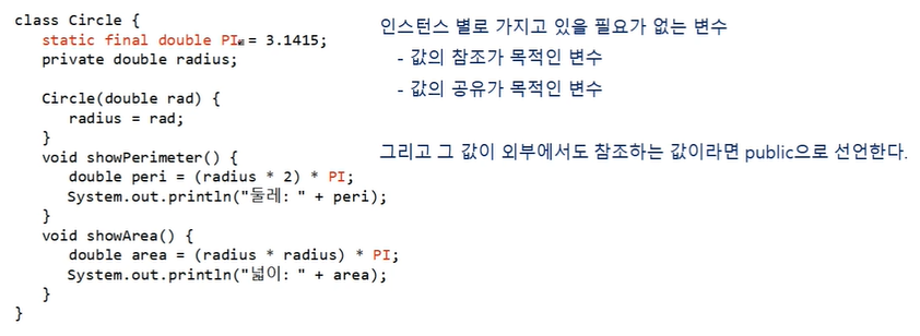인스턴스 멤버가 아닌 클래스 멤버이기 때문에 클래스에 의한 인스턴스들이 공유하는 변수(공유변수)이다. 따라서, 객체의 생성, 소멸과 상관없이 존재한다.