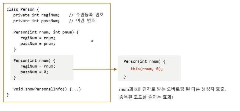 (Person(int rnum) 함수를 새롭게 만드는것 대신에, this(rnum, 0)을 통해 Person(int rnum, int pnum) 함수를 호출하는 식으로 바꾸면 중복된 코드를 줄일 수 있으므로 효율적이다.)