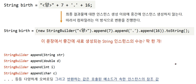 StringBuilder라는 임시공간에 append를 통해 여러 type들을 넣어주고 맨 마지막에 toString()을 통해 문자열로 바꾸어준다. => 사용하는 공간이 2개(StringBuilder, birth)뿐이므로 메모리 부담감이 작아져 효율적이다!