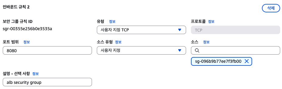 - 그런데, 보안 그룹에서 8080 포트에 대한 인바운드를 열어주지 않으면 ALB가 접근할 수 없음.