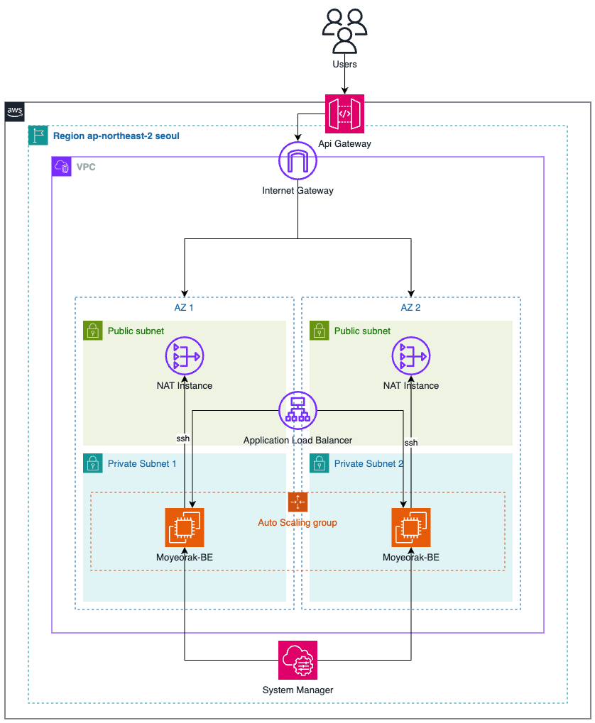 - 보안을 위해 private subnet 내의 EC2 인스턴스에서 스프링 프로젝트를 구동 중