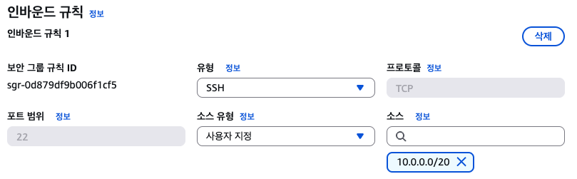 - EC2 인스턴스의 보안 그룹 (ssh, source: public subent의 IP CIDR)