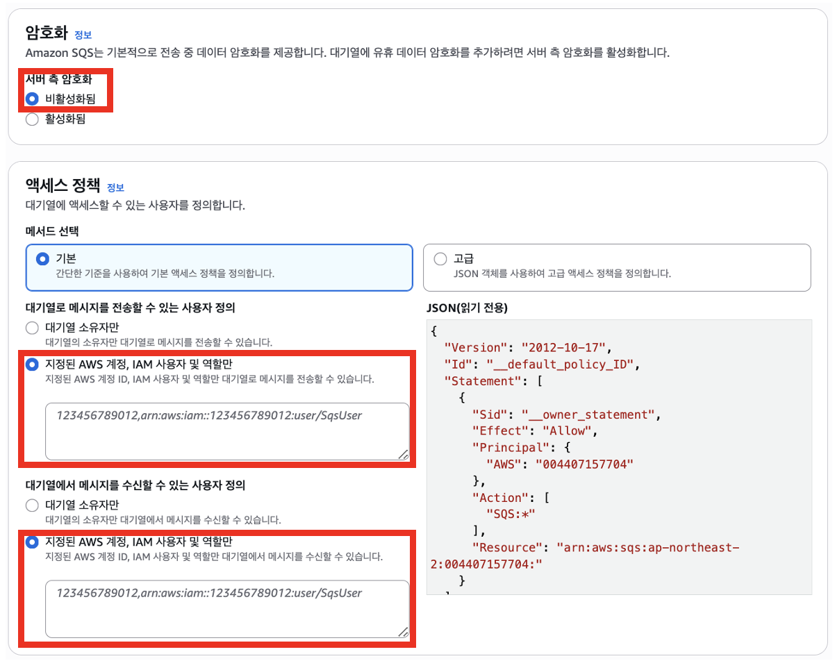 안에 값에는, 위에서 생성한 sqs권한 사용자의 ARN 값을 붙여넣기 하면 된다.
