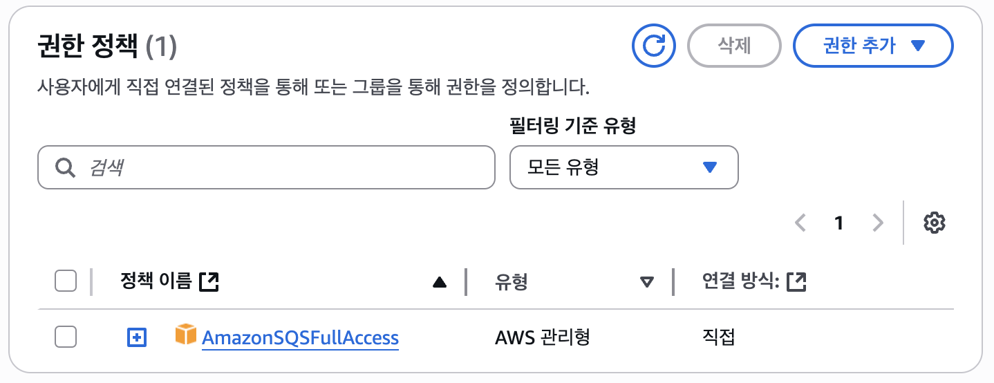 "AmazonSQSFullAccess" 정책을 가진 IAM 사용자를 생성해준다.