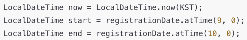 LocalDateTime end = registrationDate.atTime(10, 0);