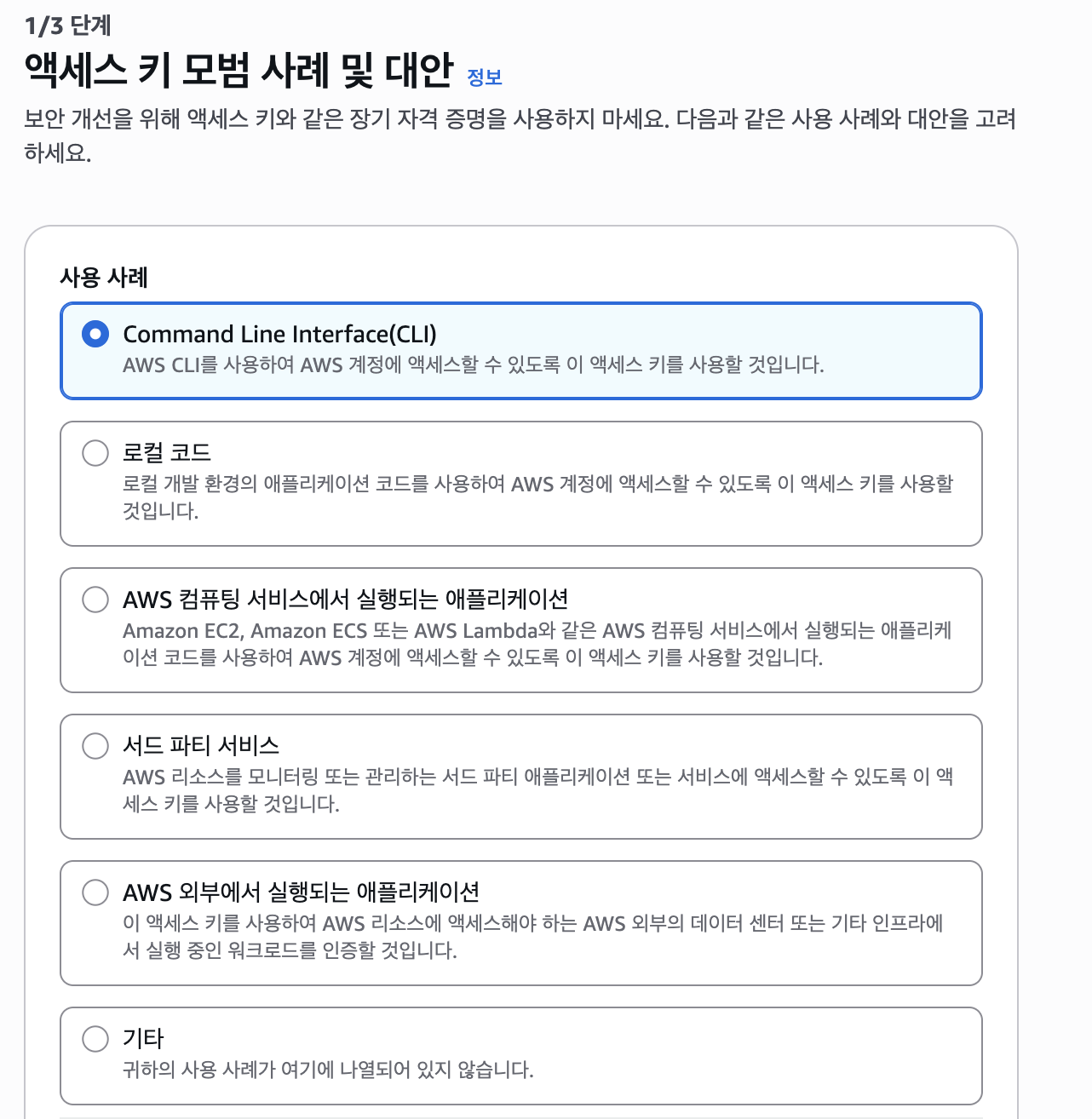 aws cli에서 사용할 것이기 때문에, CLI 액세스 키를 선택한다.