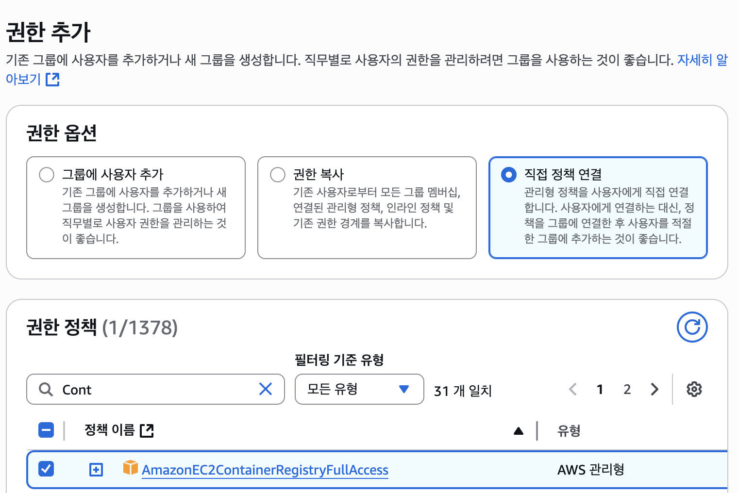 현재 백엔드 배포중인 인스턴스에 연결된 IAM 역할로 "AmazonEC2ContainerRegistryFullAccess" 를 추가해준다.