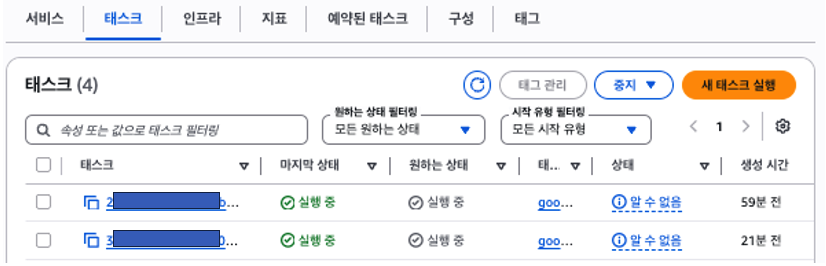 제대로 수행했다면, 블루/그린 배포 방식이기 떄문에 2개의 태스크가 실행중인것을 확인할 수 있다.