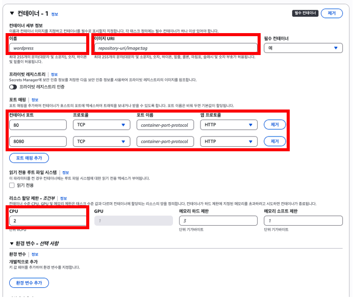 태스크 실행 역할은 escTaskExecutionRole로 설정한다.