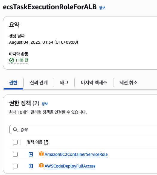 iam은 'AmazonEC2ContainerServiceRole'과 'AWS CodeDeployFullAccess' 권한을 가진 역할을 생성해서 선택했다.