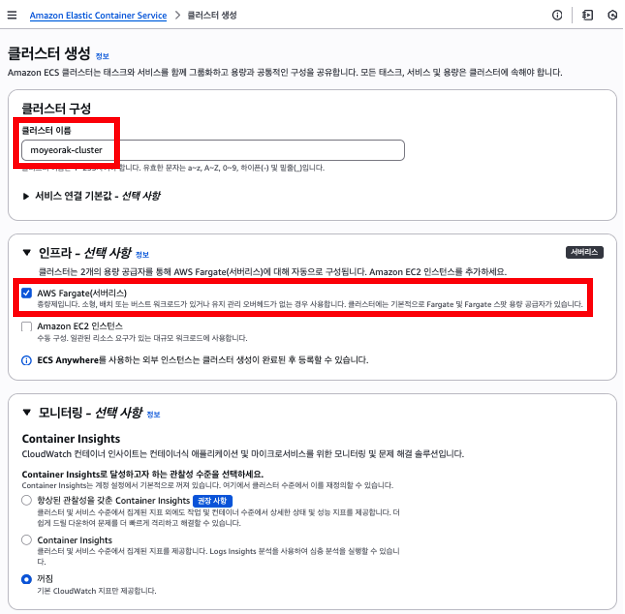- Fargate 클러스터: 서버리스 방식. 인프라 관리 없이 AWS가 컨테이너 실행을 위한 인프라를 자동으로 제공.