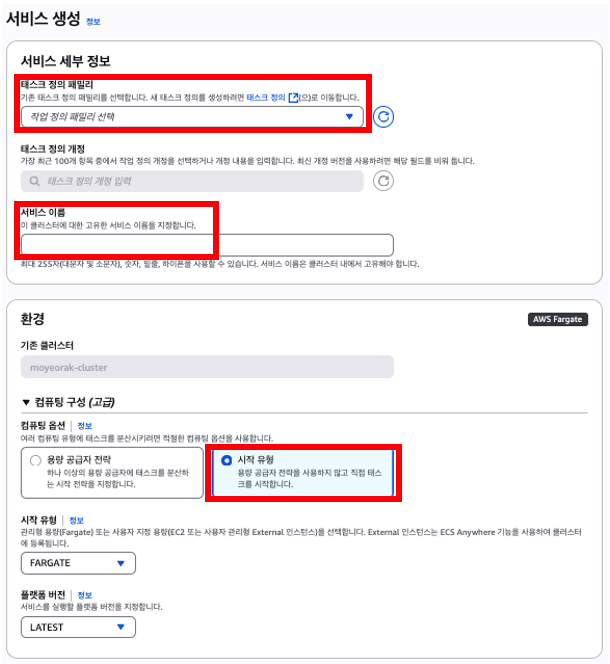 클러스터에 맞춰서 'Fargate'로 시작 유형을 선택한다.