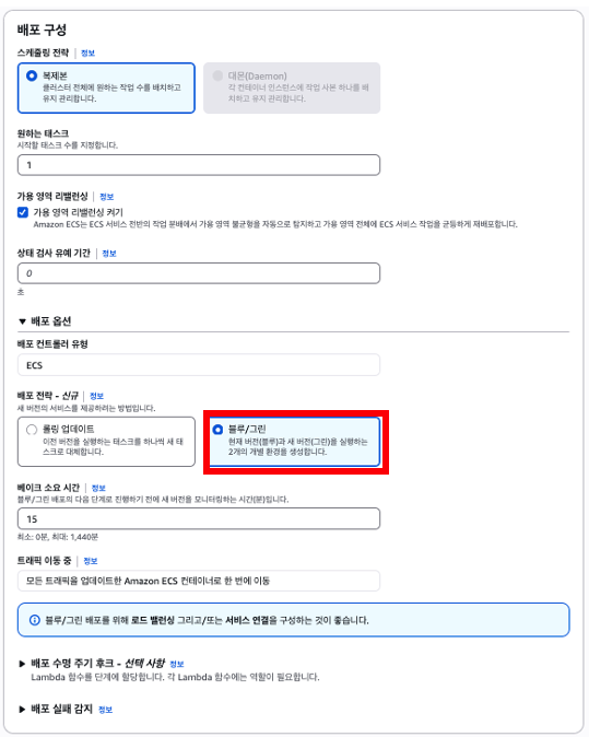 나는 CodeDeloy를 하기 위해서 블루/그린 배포전략을 선택했다.