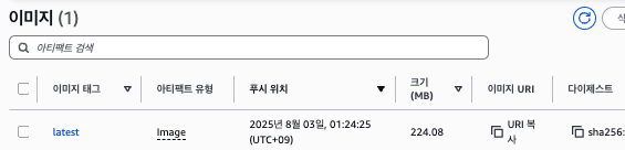 ECR 리포지토리에서 latest 이미지를 확인할 수 있다.