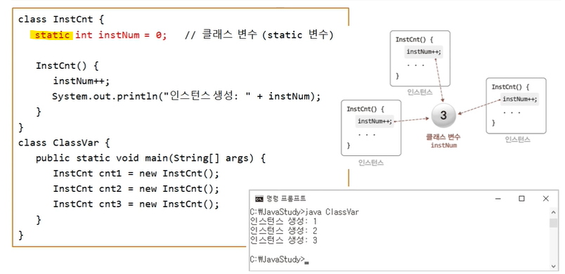 인스턴스 멤버가 아닌 클래스 멤버이기 때문에 클래스에 의한 인스턴스들이 공유하는 변수(공유변수)이다. 따라서, 객체의 생성, 소멸과 상관없이 존재한다.